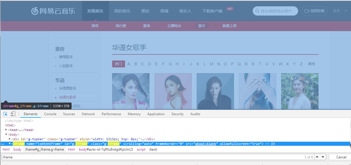 用 selenium 库处理时还有一个坑需要注意,需要提取的页面元素不在主框架frame 里面,而是在其中的一个子框架 iframe 里面,需要找到这个子框架的 id,并切换到这个子框架后才提取页面。怎么找到这个子框架呢?教大家一个笨方法,在元素区域搜索 iframe,点到搜索到的 iframe,如果阴影区域包括你需要提取的元素,那就是这个 iframe,提取它的 id 即可。