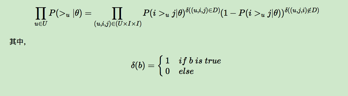 为了便于表述,我们用>u符号表示用户u的偏好,上面的<u,i,j>可以表示为:i >u j。