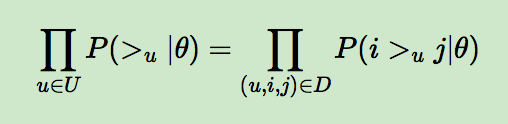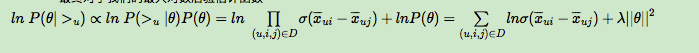 BPR 基于最大后验估计P(W,H|>u)来求解模型参数W,H,这里我们用θ来表示参数W和H, >u代表用户u对应的所有商品的全序关系,则优化目标是P(θ|>u)。根据贝叶斯公式,我们有: