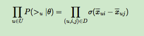 上面的式子类似于极大似然估计,若用户u相比于j来说更偏向i,那么我们就希望P(i >u j|θ)出现的概率越大越好。