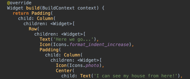 Widgets are typically simple, each doing one thing well: Text, Icon, Padding, Center, Column, Row, … To achieve any non-trivial outcome, many widgets must be composed. So our single expression easily becomes a deeply nested tree of widget constructor calls: