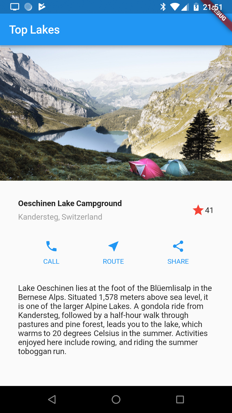 flutter.io 的 布局教程 提供了一个说明性的例子——看起来像是——一个湖泊探险家应用程序。