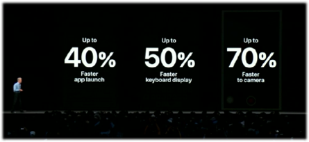 性能提升到实际上有多显著呢?苹果表示,就拿几年前非常受欢迎的 iPhone 6s 来说,iOS 12 可以让常见的应用程序启动速度提升 40%,输入法键盘响应速度提升超过 50%,摄像头拍摄时启动速度比原来快 70%。