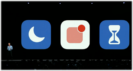 - Screen Time 新 “屏幕时间”:是一款可以为用户提供设备详细使用信息的工具,帮助用户更好地理解和控制使用应用程序和浏览网页的时间。每周都会给用户一份手机使用情况的非常详细的总结报告,包括每日在单个应用程序上花费的总时间、应用程序类别的使用情况、收到的通知数量以及被接收的频率等。用户或可以设定 app 的使用时长,当使用该 app 到达时长时,就不能再正常使用该 app。同时,父母通过 iCloud 家庭共享功能直接从自己的 iOS 设备上访问孩子的详细报告,然后安排时间限制孩子的 iOS 设备何时可以使用,比如在学习或睡觉的时间限制。