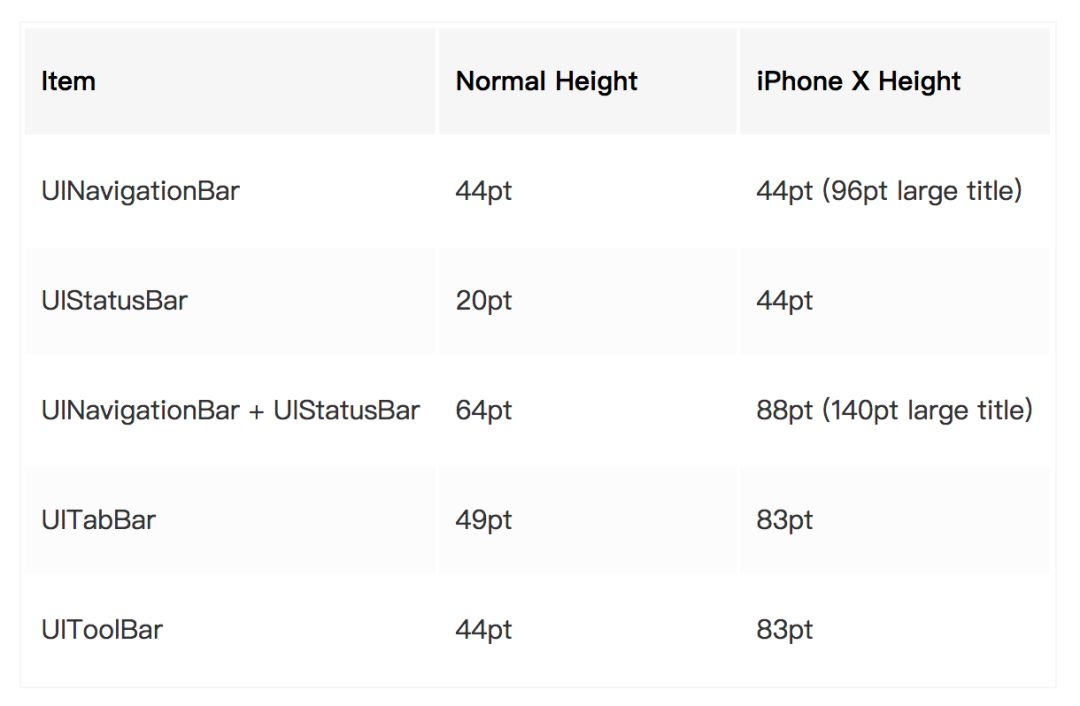 根据苹果官方的文档,iPhone X 顶部状态栏的适配安全区域的高度为 44pt,底部操作条区域的高度为 34pt。另外,在 iPhone X 中,一些系统 Bar 的默认高度相比于之前的设备也发生了变化,如下表所示。