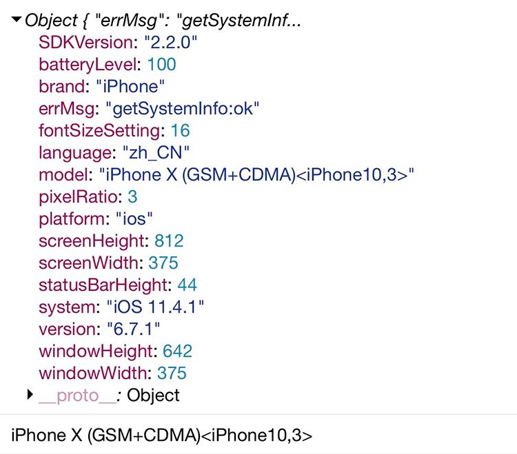 NOTE: 这里有一个小坑需要注意,在微信开发者工具中的模拟器,如果选择为 iPhone X,此时获取到的 model 值为 iPhone X,导致我以为真机也是这个值,于是直接用 if (model == 'iPhone X') 来判断,但其实真机下 model 的值为这种格式: iPhone X (GSM+CDMA)<iPhone10,3>,因此我们需要用字符串检索匹配进行判断。