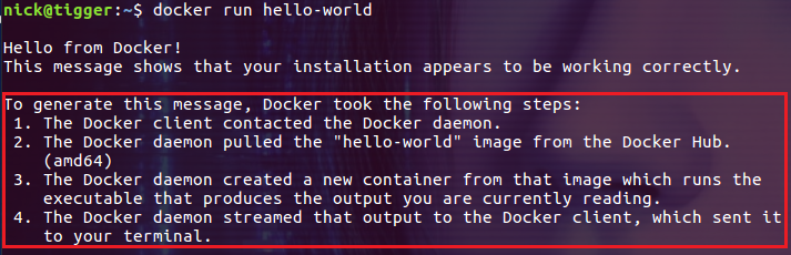 上面的输出信息指出,hello-world 容器的运行经历了如下四步: