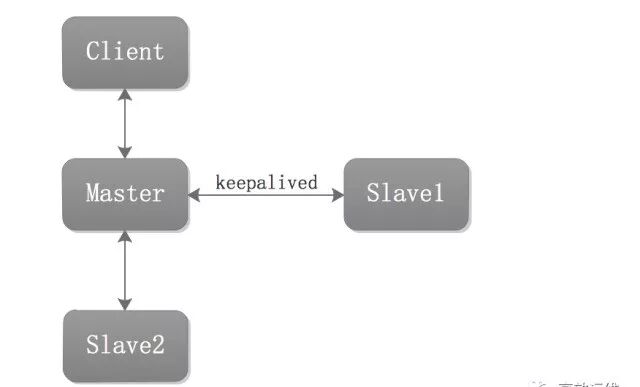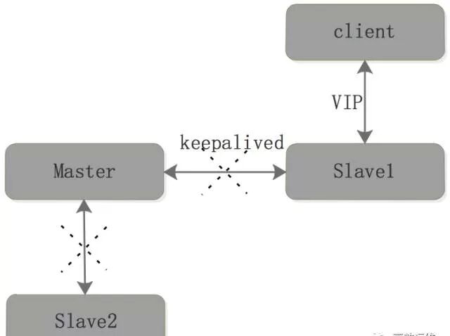 这种架构同样是一个Master和两个Slave。不同的是Master和Slave1使用keepalived进行VIP转移。Client连接Master的时候是通过VIP进行连接的。避免了方案一IP更改的情况。