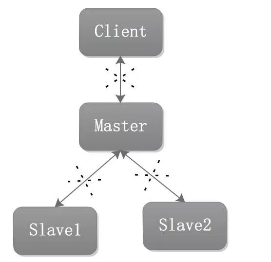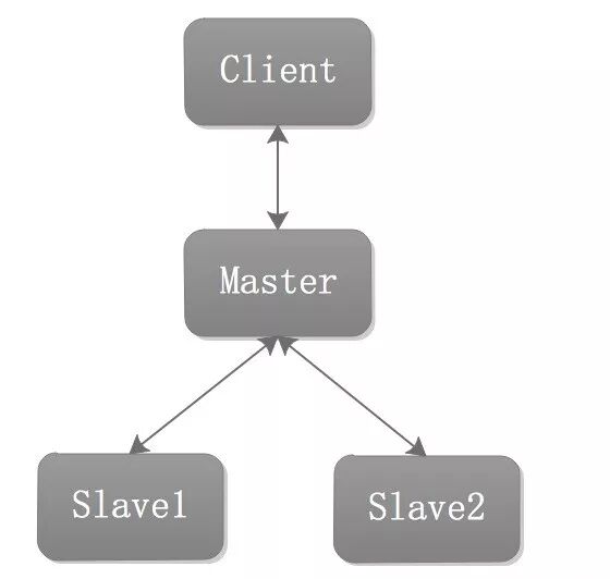 这是最常见的一种架构,一个Master节点,两个Slave节点。客户端写数据的时候是写Master节点,读的时候,是读取两个Slave,这样实现读的扩展,减轻了Master节点读负载。 -