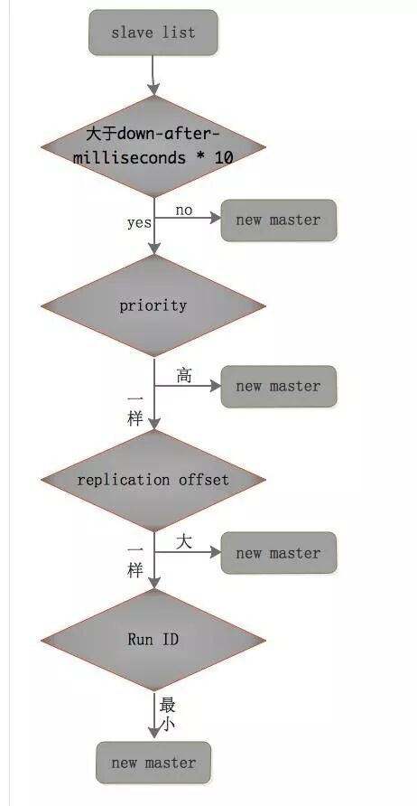 a) 与master断开时间 如果与master断开的时间超过down-after-milliseconds(sentinel配置) * 10秒加上从sentinel判定master不可用到sentinel开始执行故障转移之间的时间,就认为该slave不适合提升为master。b) slave优先级每个slave都有优先级,保存在redis.conf配置文件里。如果优先级相同,则继续进行。c) 复制偏移位置复制偏移纪录着从master复制数据复制到哪里,复制偏移越大表明从master接受的数据越多,如果复制偏移量也一样,继续进行选举d) Run ID选举具有最小Run ID的Slave作为新的Master流程图如下: