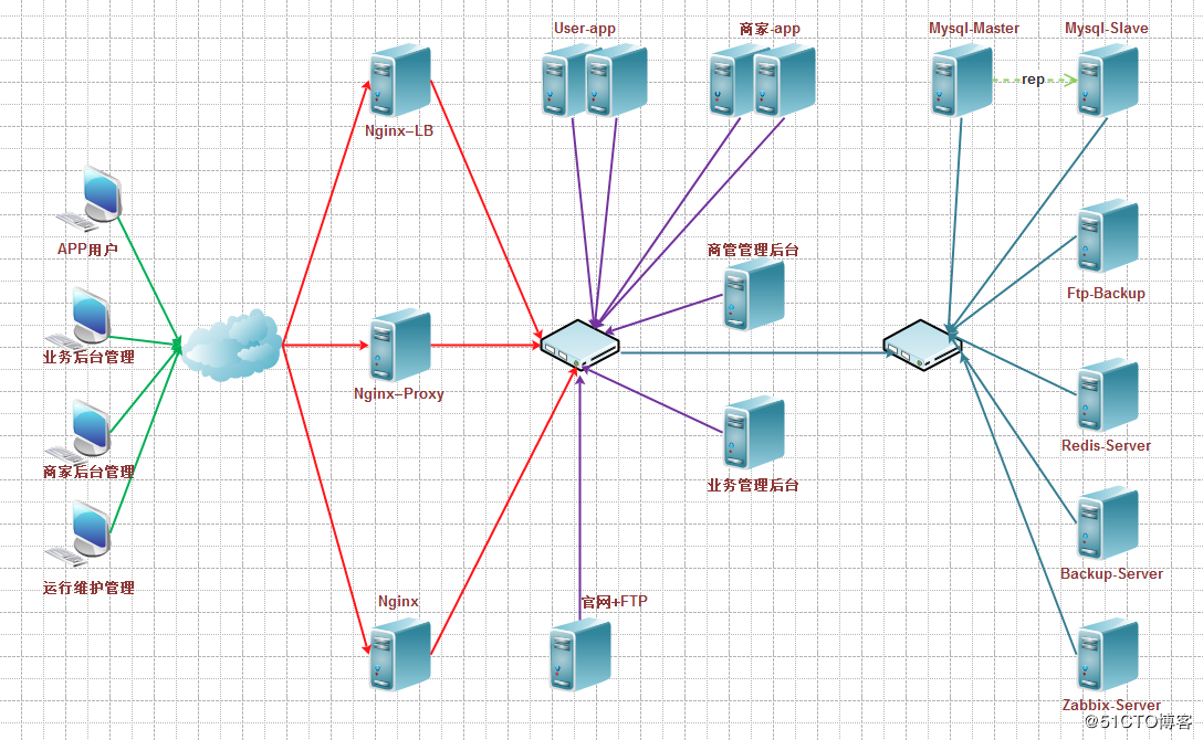 3、 业务平台管理后台采用JAVA环境布署,初始环境一台服务器,前端使用nginx 反向代理,后续业务流量扩大,架构重新扩展