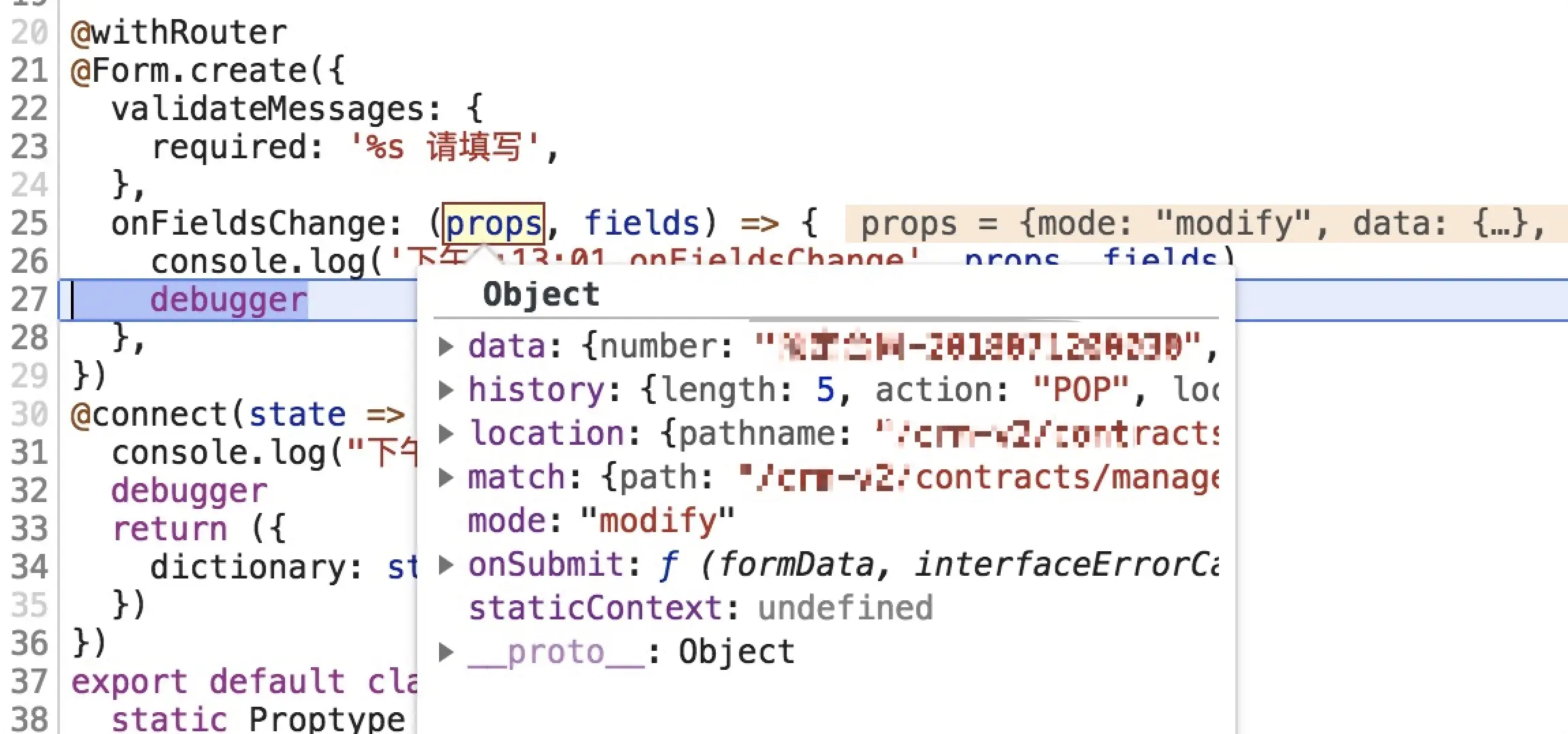 要想拿到所有的props,请按照下图这样做:(最先执行的是Form.create()返回的函数,所以后面执行的函数以及传递的props都会被onFieldsChange接收到):