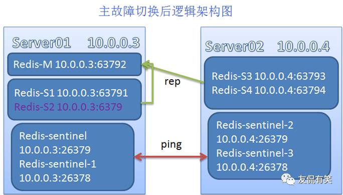 可以看出判定master主观下线(+sdown),sentinel选举10.0.0.3 63792为新的主服务器,其它slave自动执行slaveof ,故障转移成功