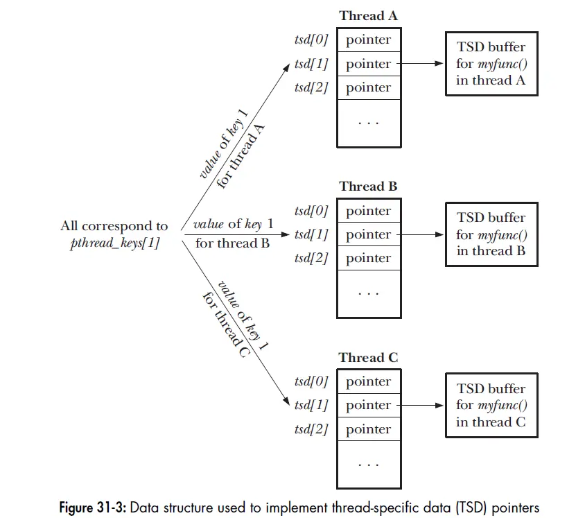 pthread_key_create()的函数作为pthread_once()的参数,调用pthread_once()保证一次创建key的行为- 通过