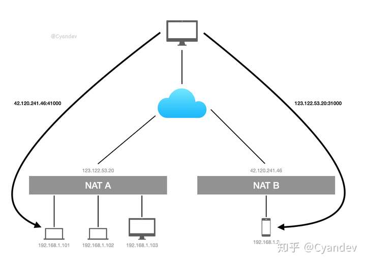 接下来 NAT B 将回复包再发回 NAT A,此时就是 NAT 发挥作用的时候了,NAT A 现在要做的就是将包再分发回之前的设备,如何确定要发给谁呢?NAT 中记录了一张表,之前 192.168.1.101 通过 2333 端口与 42.120.241.46 端口 443 通讯了,并且 NAT A 是用 60001 的端口转发出去的,那么这次接受到发往该 NAT 60001 端口的包时就应该再通过 2333 端口转发给 192.168.1.101。经过这样的过程,NAT A 下的设备都可以连接到互联网了!