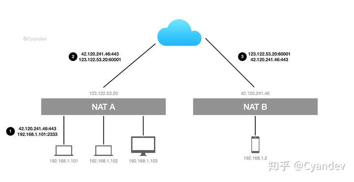 首先,NAT A 网下的设备 1(192.168.1.101)想与某公网 IP 通讯,设备 1 将包发给 NAT A,然后 NAT A 对源 IP 进行转换发给 NAT B(中间可能还会经过多重 NAT)。