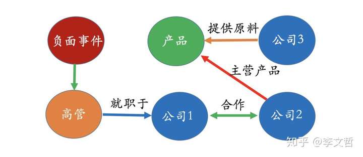 在证券领域,我们经常会关心比如“一个事件发生了,对哪些公司产生什么样的影响?” 比如有一个负面消息是关于公司1的高管,而且我们知道公司1和公司2有种很密切的合作关系,公司2有个主营产品是由公司3提供的原料基础上做出来的。