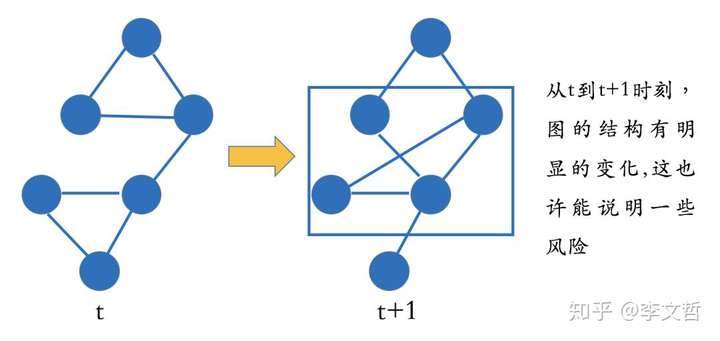 以上所有的分析都是基于静态的关系图谱。所谓的静态关系图谱,意味着我们不考虑图谱结构本身随时间的变化,只是聚焦在当前知识图谱结构上。然而,我们也知道图谱的结构是随时间变化的,而且这些变化本身也可以跟风险有所关联。
