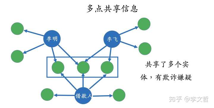 这种方法比较适用于找出团体欺诈,它的核心在于通过一些模式来找到有可能存在风险的团体或者子图(sub-graph),然后对这部分子图做进一步的分析。 这种模式有很多种,在这里举几个简单的例子。 比如在下图中,三个实体共享了很多其他的信息,我们可以看做是一个团体,并对其做进一步的分析。