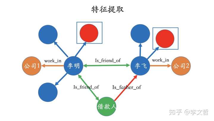 我们也可以基于规则从知识图谱中提取一些特征,而且这些特征一般基于深度的搜索比如2度,3度甚至更高维度。比如我们可以问一个这样的问题:“申请人二度关系里有多少个实体触碰了黑名单?”,从图中我们很容观察到二度关系中有两个实体触碰了黑名单(黑名单由红色来标记)。等这些特征被提取之后,一般可以作为风险模型的输入。在此还是想说明一点,如果特征并不涉及深度的关系,其实传统的关系型数据库则足以满足需求。