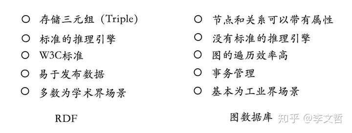 知识图谱主要有两种存储方式:一种是基于RDF的存储;另一种是基于图数据库的存储。它们之间的区别如下图所示。RDF一个重要的设计原则是数据的易发布以及共享,图数据库则把重点放在了高效的图查询和搜索上。其次,RDF以三元组的方式来存储数据而且不包含属性信息,但图数据库一般以属性图为基本的表示形式,所以实体和关系可以包含属性,这就意味着更容易表达现实的业务场景。