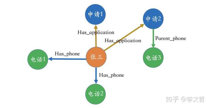 举个例子,可以观察一下下面这个图谱,并试问自己背后的业务逻辑是什么。通过一番观察,其实也很难看出到底业务流程是什么样的。做个简单的解释,这里的实体-“申请”意思就是application,如果对这个领域有所了解,其实就是进件实体。在下面的图中,申请和电话实体之间的“has_phone”,“parent phone”是什么意思呢?