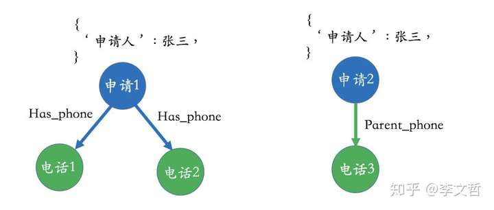 接下来再看一下下面的图,跟之前的区别在于我们把申请人从原有的属性中抽取出来并设置成了一个单独的实体。在这种情况下,整个业务逻辑就变得很清晰,我们很容易看出张三申请了两个贷款,而且张三拥有两个手机号,在申请其中一个贷款的时候他填写了父母的电话号。总而言之,一个好的设计很容易让人看到业务本身的逻辑。