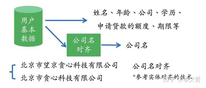 举个例子,对于用户的基本信息,我们很可能需要如下的操作。一方面,用户信息比如姓名、年龄、学历等字段可以直接从结构化数据库中提取并使用。但另一方面,对于填写的公司名来说,我们有可能需要做进一步的处理。比如部分用户填写“北京贪心科技有限公司”,另外一部分用户填写“北京望京贪心科技有限公司”,其实指向的都是同一家公司。所以,这时候我们需要做公司名的对齐,用到的技术细节可以参考前面讲到的实体对齐技术。