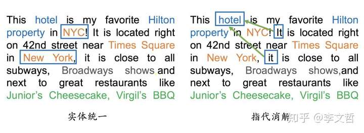 另外,在实体命名识别和关系抽取过程中,有两个比较棘手的问题:一个是实体统一,也就是说有些实体写法上不一样,但其实是指向同一个实体。比如“NYC”和“New York”表面上是不同的字符串,但其实指的都是纽约这个城市,需要合并。实体统一不仅可以减少实体的种类,也可以降低图谱的稀疏性(Sparsity);另一个问题是指代消解,也是文本中出现的“it”, “he”, “she”这些词到底指向哪个实体,比如在本文里两个被标记出来的“it”都指向“hotel”这个实体。
