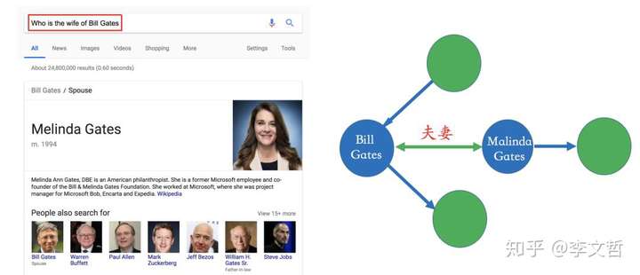 知识图谱应用的前提是已经构建好了知识图谱,也可以把它认为是一个知识库。这也是为什么它可以用来回答一些搜索相关问题的原因,比如在Google搜索引擎里输入“Who is the wife of Bill Gates?”,我们直接可以得到答案-“Melinda Gates”。这是因为我们在系统层面上已经创建好了一个包含“Bill Gates”和“Melinda Gates”的实体以及他俩之间关系的知识库。所以,当我们执行搜索的时候,就可以通过关键词提取("Bill Gates", "Melinda Gates", "wife")以及知识库上的匹配可以直接获得最终的答案。这种搜索方式跟传统的搜索引擎是不一样的,一个传统的搜索引擎它返回的是网页、而不是最终的答案,所以就多了一层用户自己筛选并过滤信息的过程。