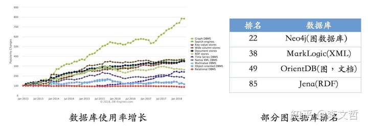 根据最新的统计(2018年上半年),图数据库仍然是增长最快的存储系统。相反,关系型数据库的增长基本保持在一个稳定的水平。同时,我们也列出了常用的图数据库系统以及他们最新使用情况的排名。 其中Neo4j系统目前仍是使用率最高的图数据库,它拥有活跃的社区,而且系统本身的查询效率高,但唯一的不足就是不支持准分布式。相反,OrientDB和JanusGraph(原Titan)支持分布式,但这些系统相对较新,社区不如Neo4j活跃,这也就意味着使用过程当中不可避免地会遇到一些刺手的问题。如果选择使用RDF的存储系统,Jena或许一个比较不错的选择。
