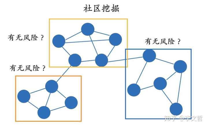 社区挖掘算法的目的在于从图中找出一些社区。对于社区,我们可以有多种定义,但直观上可以理解为社区内节点之间关系的密度要明显大于社区之间的关系密度。下面的图表示社区发现之后的结果,图中总共标记了三个不同的社区。一旦我们得到这些社区之后,就可以做进一步的风险分析。
