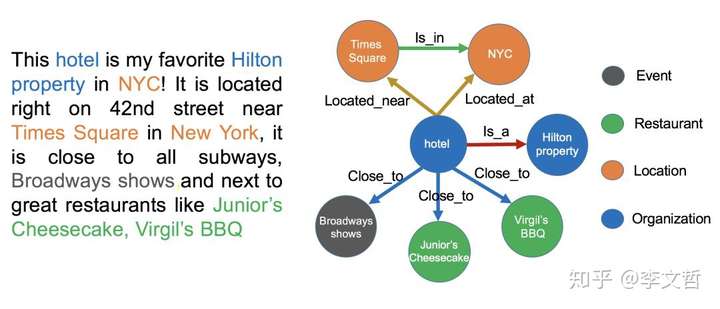 首先是实体命名识别,就是从文本里提取出实体并对每个实体做分类/打标签:比如从上述文本里,我们可以提取出实体-“NYC”,并标记实体类型为 “Location”;我们也可以从中提取出“Virgil's BBQ”,并标记实体类型为“Restarant”。这种过程称之为实体命名识别,这是一项相对比较成熟的技术,有一些现成的工具可以用来做这件事情。其次,我们可以通过关系抽取技术,把实体间的关系从文本中提取出来,比如实体“hotel”和“Hilton property”之间的关系为“in”;“hotel”和“Time Square”的关系为“near”等等。