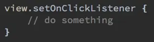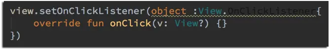 object 声明一个类并创建它的实例。以上代码就声明并且创建了一个实现 OnClickListener 的对象实例,是不是似曾相识的感觉,嗯这就相当于 Java 中的匿名内部类嘛。话是这么说,但是他们又有不同之处,Kotlin 对其做了功能增强,一是对象表达式可以访问闭包中的变量,但不仅限于 final 变量,原理就像我们在 Java 中显式做的一样,创建了一个 final 类来持有你访问的变量,这省去了我们自己实现的麻烦;二是在与 Java 互交互中所体现的 SAM 转换,你应该注意到上方图片的一根警示线,提醒我们有更地道的实现:如果对象是单个抽象方法的 Java 接口,可以用 lambda 表达式代替。