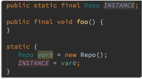 一目了然,对于 B 类是运行时解析,对应到多态,而对于 A 在编译期就决定了。这也跟实现原理相关,最后放一个原理的小例子,这个相对就简单多了,一看便知: