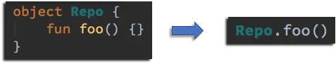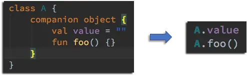 A,在 A 中定义它的伴生对象 (companion object),接下来我们就可以直接在 Kotlin 中调用。看起来很像 Java 中的静态调用,然而并没有那么简单。“伴生”二字指明了伴生对象的作用域等于它所属的类(这个例子中是 A)。事实也是如此,在运行时它们仍然是类的实例成员(在 Java 中是静态实例引用)。