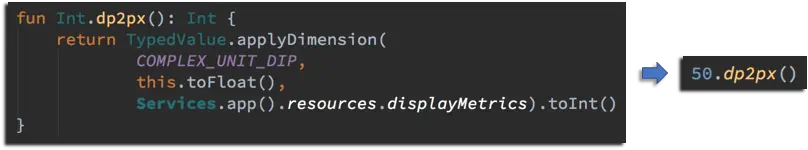 Int 定义了一个扩展方法 dp2px,这个方法是 Android 开发同学的老朋友了,根据设备的屏幕分辨率返回指定数值所对应的实际显示像素。功能我们可以暂时不管,如果我们每次都写一串再转换一下,想想觉得整个人都不好了,工具类在所难免。可是每次都是这样的形式,这样的工具类要一打有一打,一是时间久了我都忘记哪个方法在哪个类里(或哪个类里有什么方法)了,二是调用起来也不方便,还需要把接收者作为参数传递进去。