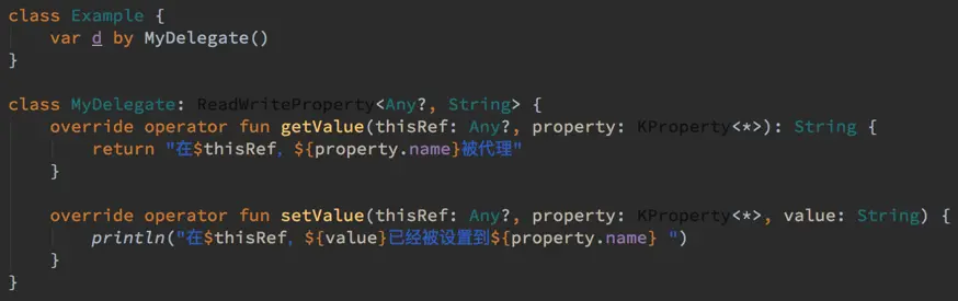 现在,我们自定义一个属性委托,为了方便我们直接使用 Kotlin 给我们提供好的接口 ReadOnlyProperty (对应val) 和 ReadWriteProperty (对应 var),这俩接口其实就是我们上边所说的一个属性的两个要素的抽象。