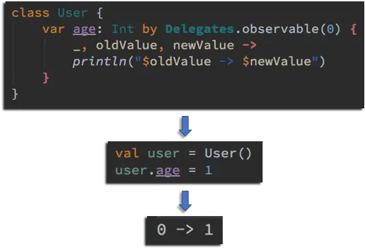 observable,传递了一个初始值 0,之后当 age 变化时,便会通知到处理函数。这是标准库提供的一个定义好的委托。妈妈再也不担心我加班写回调监听了~其他的实现可以去找源码看一下,一看便知。