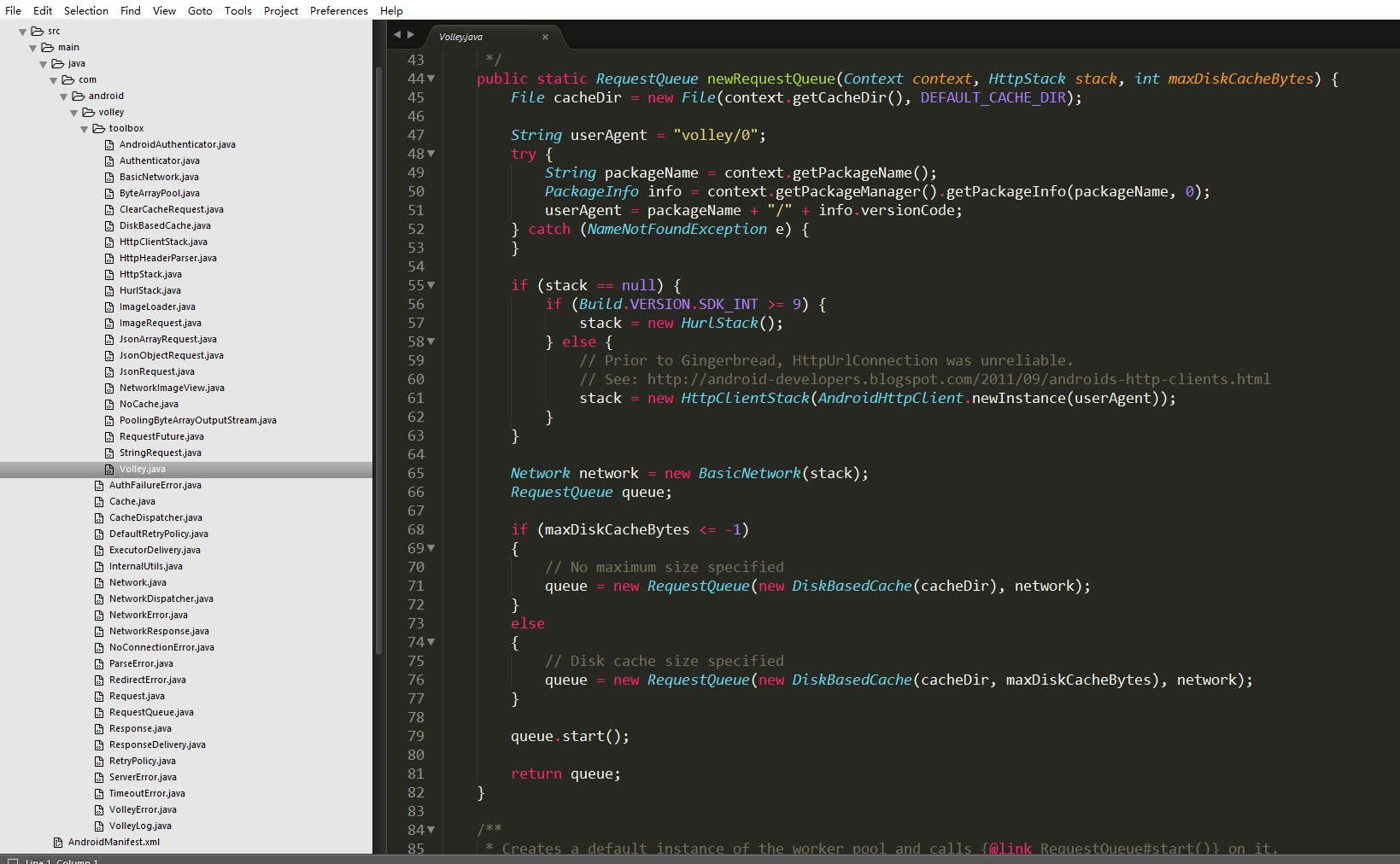 我用的 Sublime Text 3 来阅读 Volley ,可以看到 Volley 中大大小小一共43个类。 我们使用 Volley 的第一步是通过Volley 的 newRequestQueue 方法得到 一个RequestQueue 队列。那么我们就从这个方法开始吧。不管几个参数的 newRequestQueue 方法最终都会调用下面这个三个参数的。