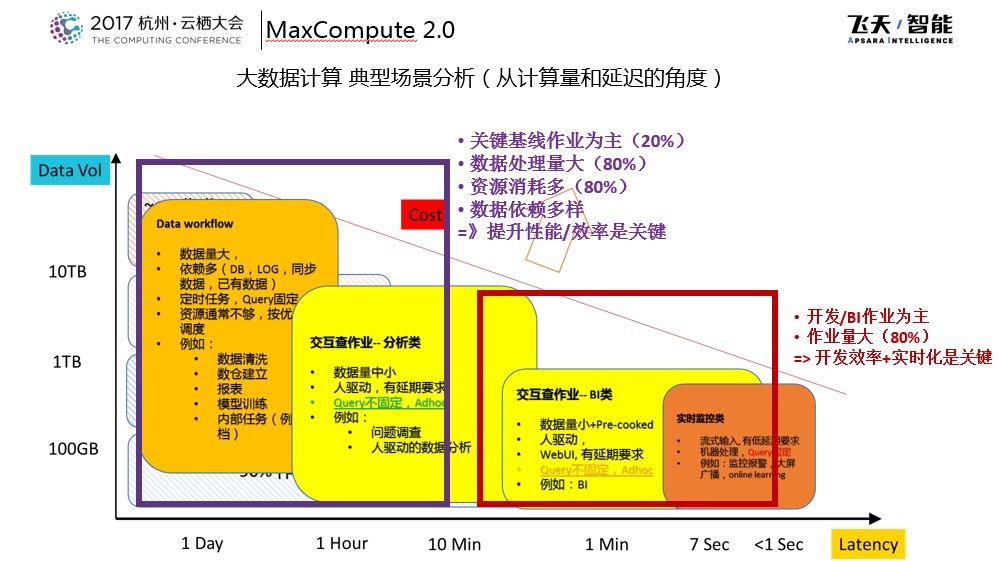 下图所示的是一个从计算量和延迟的角度看的数据轴,从数据量上看,从100GB到10TB再往上,最高可以到PB级别,在“双11”当天,MaxCompute平台处理了上百PB的数据。在延迟的角度,会达到非常低的延迟状态。可以看到图中的橘色斜线,其含义是当对于数据量以及实时性的要求越高成本就会越高,所以大数据计算的要求就是将这个轴一直向上移动,也就是能够在更短的时间内处理更大量的数据的时候成本越来越低。