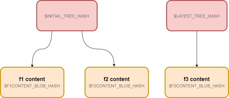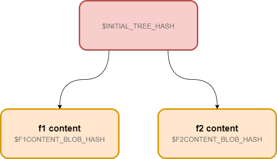 $ INITIAL_TREE_HASH=$( \ printf '%s %s %s\t%s\n' \ 100644 blob $F1CONTENT_BLOB_HASH f1.txt \ 100644 blob $F2CONTENT_BLOB_HASH f2.txt | git mktree )