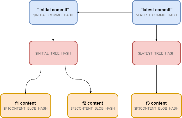 $ ls .git/objects -le0 <--- initial tree object (INITIAL_TREE_HASH)9b <--- 'f1 content' blob (F2CONTENT_BLOB_HASH)a1 <--- 'f2 content' blob (F2CONTENT_BLOB_HASH)