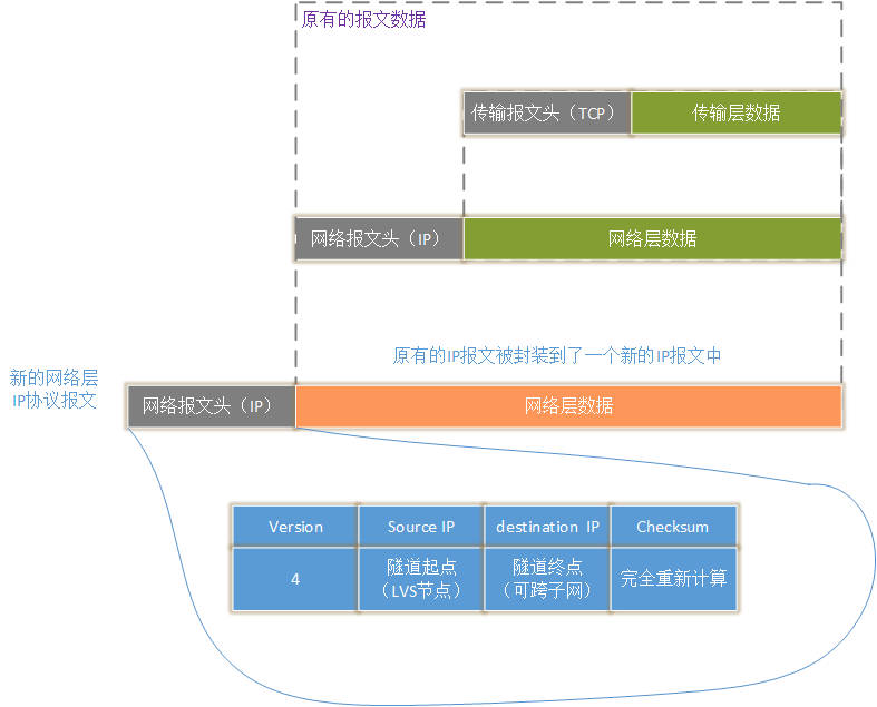 LVS-DR模式和LVS-TUN模式的工作原理完全不一样,工作场景完全不一样。DR基于数据报文重写,TUN模式基于IP隧道,后者是对数据报文的重新封装: