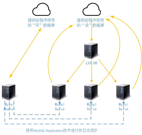 从上图可以看到,来源于程序的“写”操作通过一个数据源提交给了Mysql Master,而所有的读操作则通过LVS-DR模式分发给3个Mysql Salve。这里要说明几个问题: