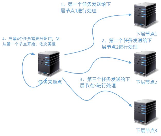 不加权轮询,就是主控节点(任务来源点)在不考虑目标节点的任何因素的情况下(例如CPU性能、磁盘性能、网络性能),按照目标节点的列表顺序将任务依次分配下去。这是最简单的轮询,也是对主控节点实现复杂性要求最低的轮询。我之前的博文《架构设计:负载均衡层设计方案(2)——Nginx安装》、《架构设计:负载均衡层设计方案(4)——LVS原理》 都对这种最简轮询进行了介绍:例如LVS中的“rr”参数。