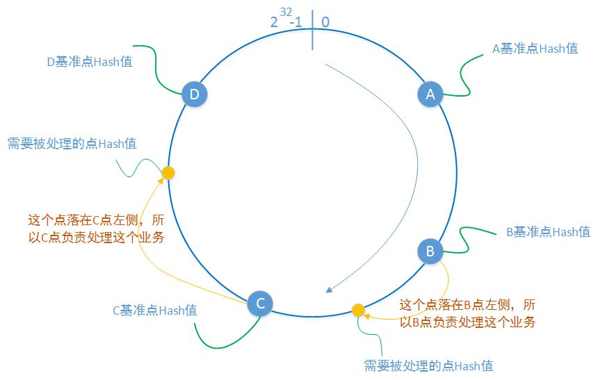 我们约定落在某一个蓝点A左侧和蓝点B右侧的黄色点所代表的请求,都有蓝点A所代表的服务器进行处理,这样就完成解决了“谁来处理”的问题。在蓝色点稳定存在的前提下,来自于同一个Hash约定的请求所落在的位置都是一样的,这就保证了服务处理映射的稳定性。