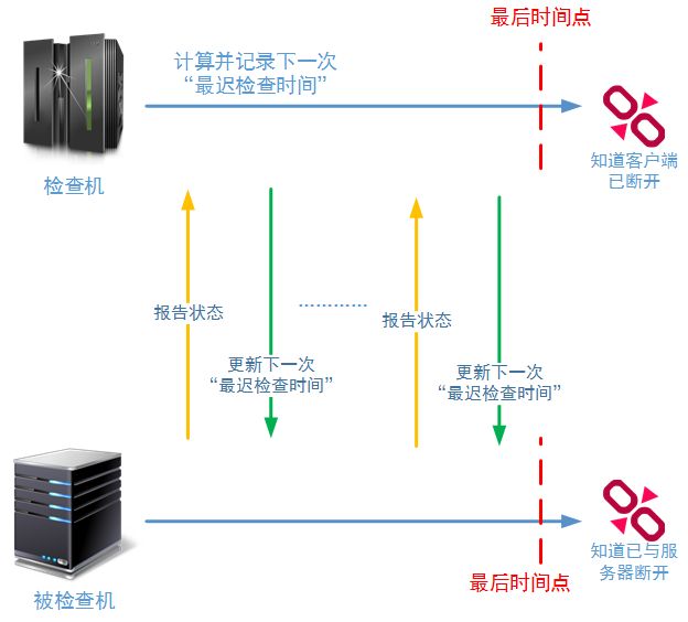 租约协议主要为了保证一个事实:如果服务器对客户端的检查操作在“最迟时间”失败后,那么服务器端肯定会注销客户端的登录信息,同时客户端上服务器的连接信息也会消失(并且不在向下提供服务)。每一次检查成功,这个“最迟时间”都会向后推移。