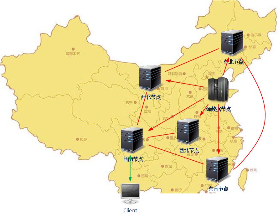我们试想一下,如果将我们要访问的资源放到离我们客户端最近的一个服务上(例如在广州的客户端访问的资源就在广州的机房)。那么是不是就解决了这个问题(这个点称为“边缘节点”)。这就是CDN网络解决的问题,如下图所示: