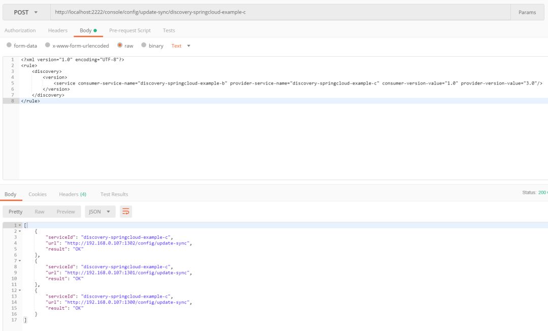 <?xml version="1.0" encoding="UTF-8"?><rule> <discovery> <version> <service consumer-service-name="discovery-springcloud-example-b" provider-service-name="discovery-springcloud-example-c" consumer-version-value="" provider-version-value="3.0"/> </version> </discovery></rule>